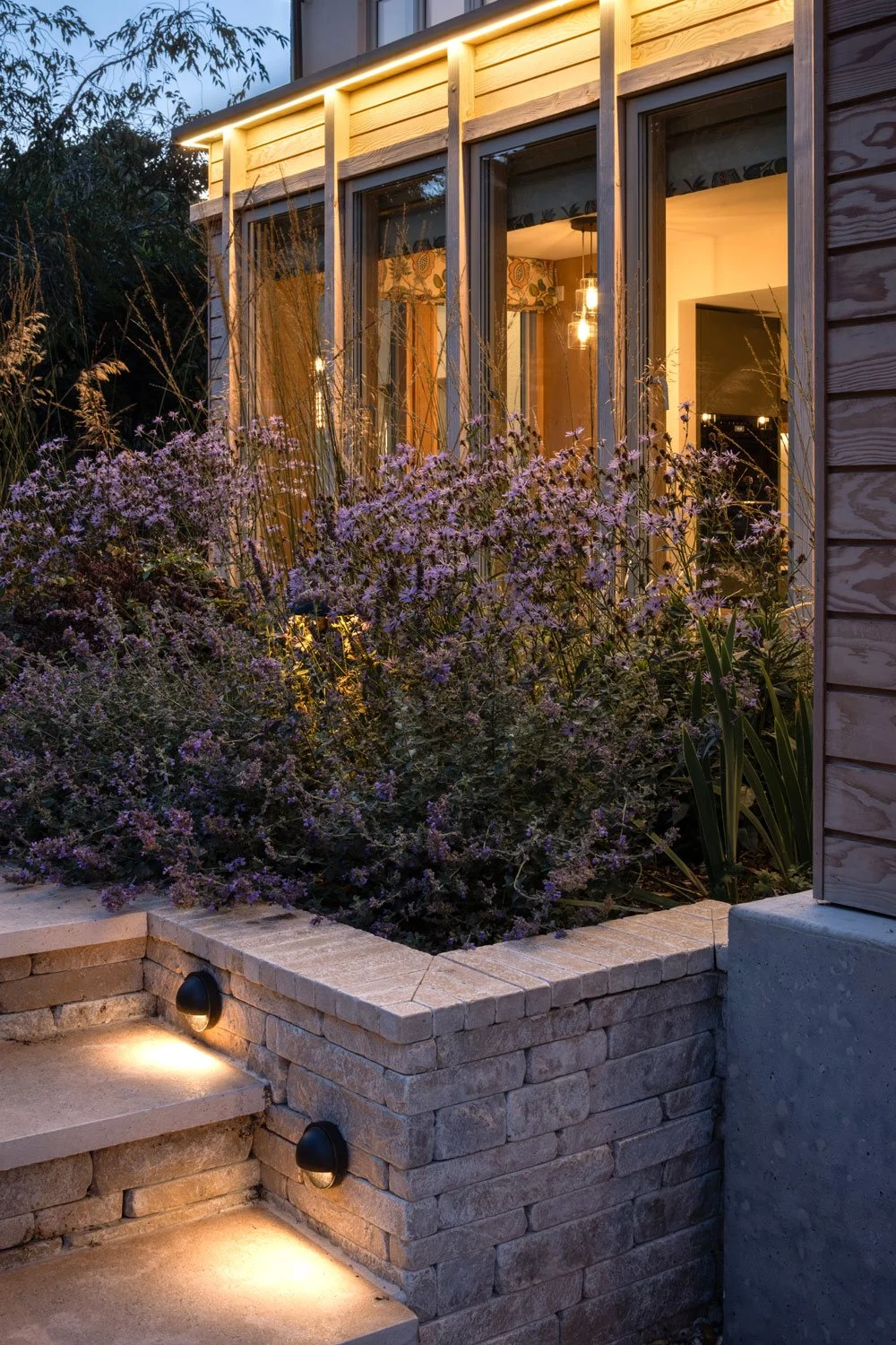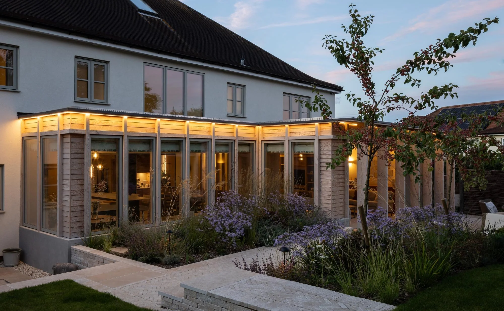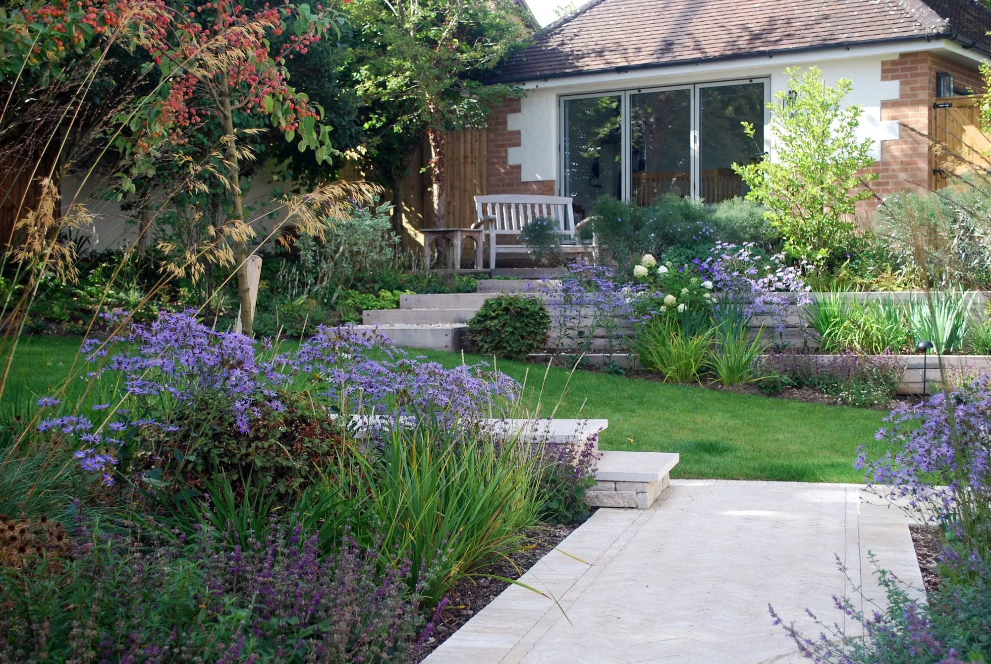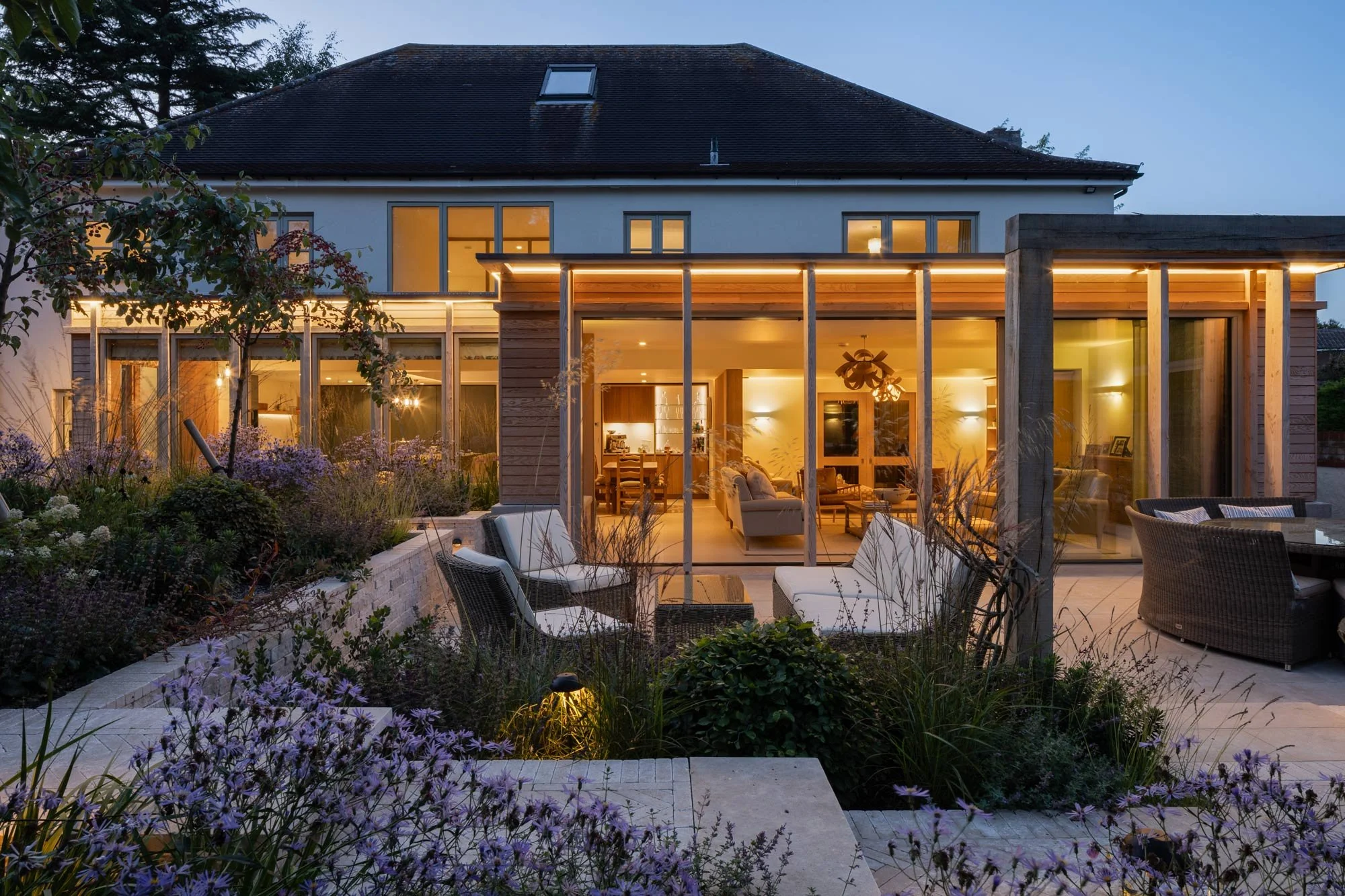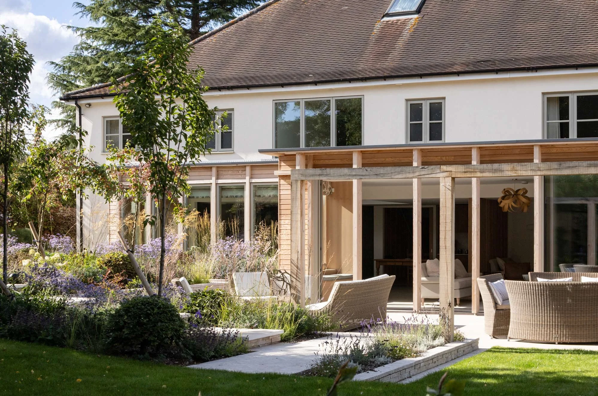 After returning to the family home from living abroad, these clients decided it was time for an update inside and out. Working collaboratively with the architect we developed an outside space that harmonises perfectly with the interior and is uniquely suited to the way the clients want to live. Using a beautiful palette of light natural stone, this garden has a fresh and relaxed feel. The formal lines are softened by the soft edges of the natural materials and the colours and textures of the planting.