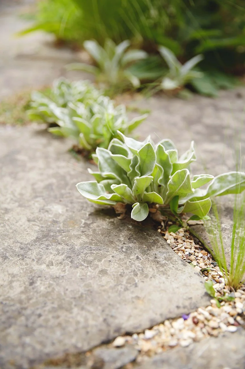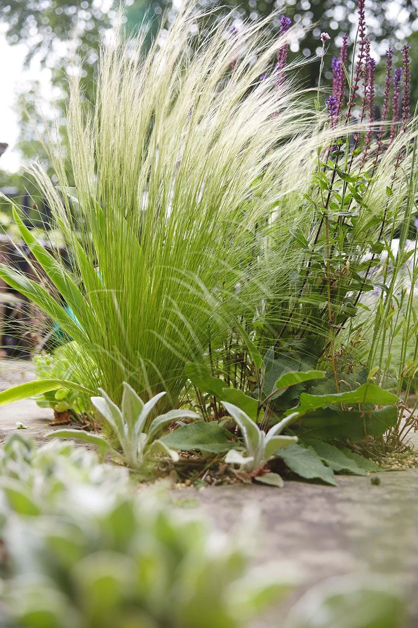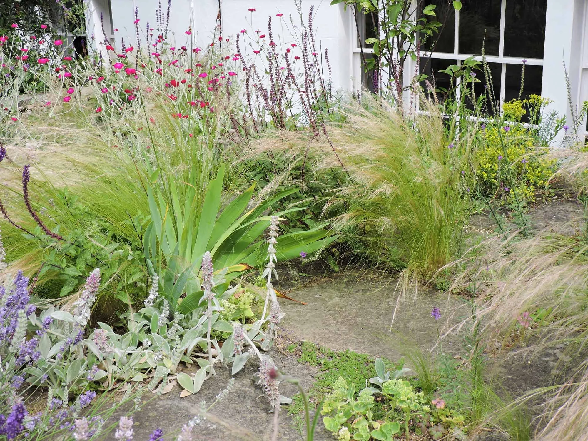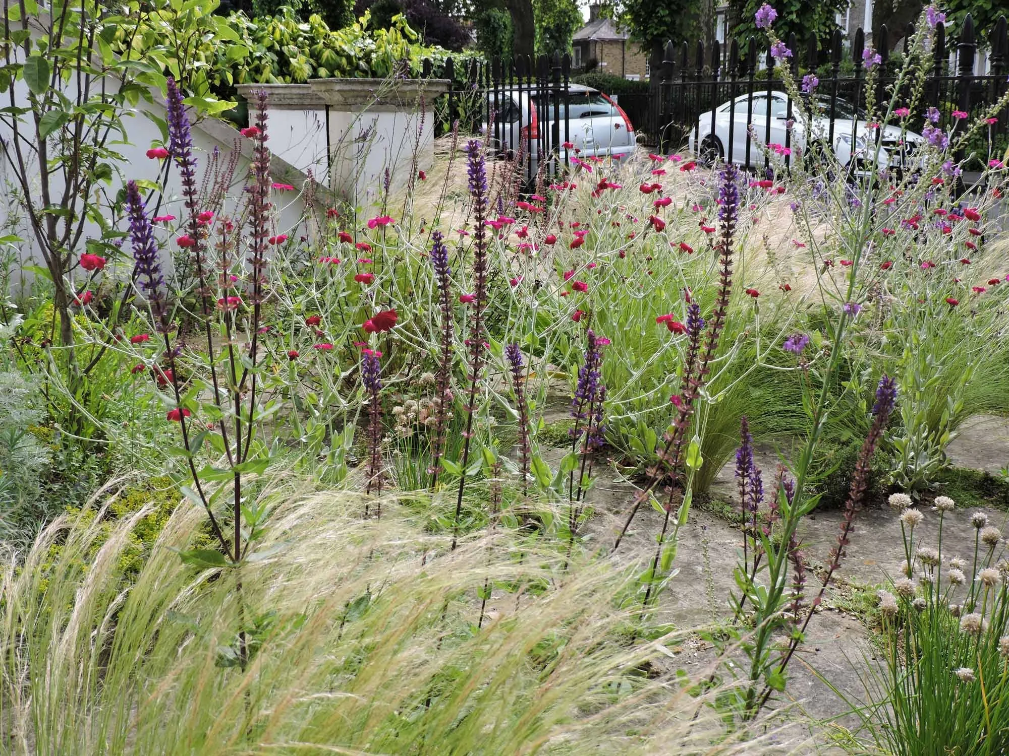 For this urban front garden we rejuvenated the inherited yorkstone paving by creating tiny areas for planting between the existing slabs. Grasses such as Nassella tenuissima and weedy plants like Linaria purpurea combine with Irises and Salvias to create a wild and naturalistic space. Plants that happily self-seed in these conditions were prioritised such as Verbena bonariensis, Lychnis coronaria and Chives. A mixed Lavender hedge against the front railings is a nod to the formal front gardens that are more usual in London squares.