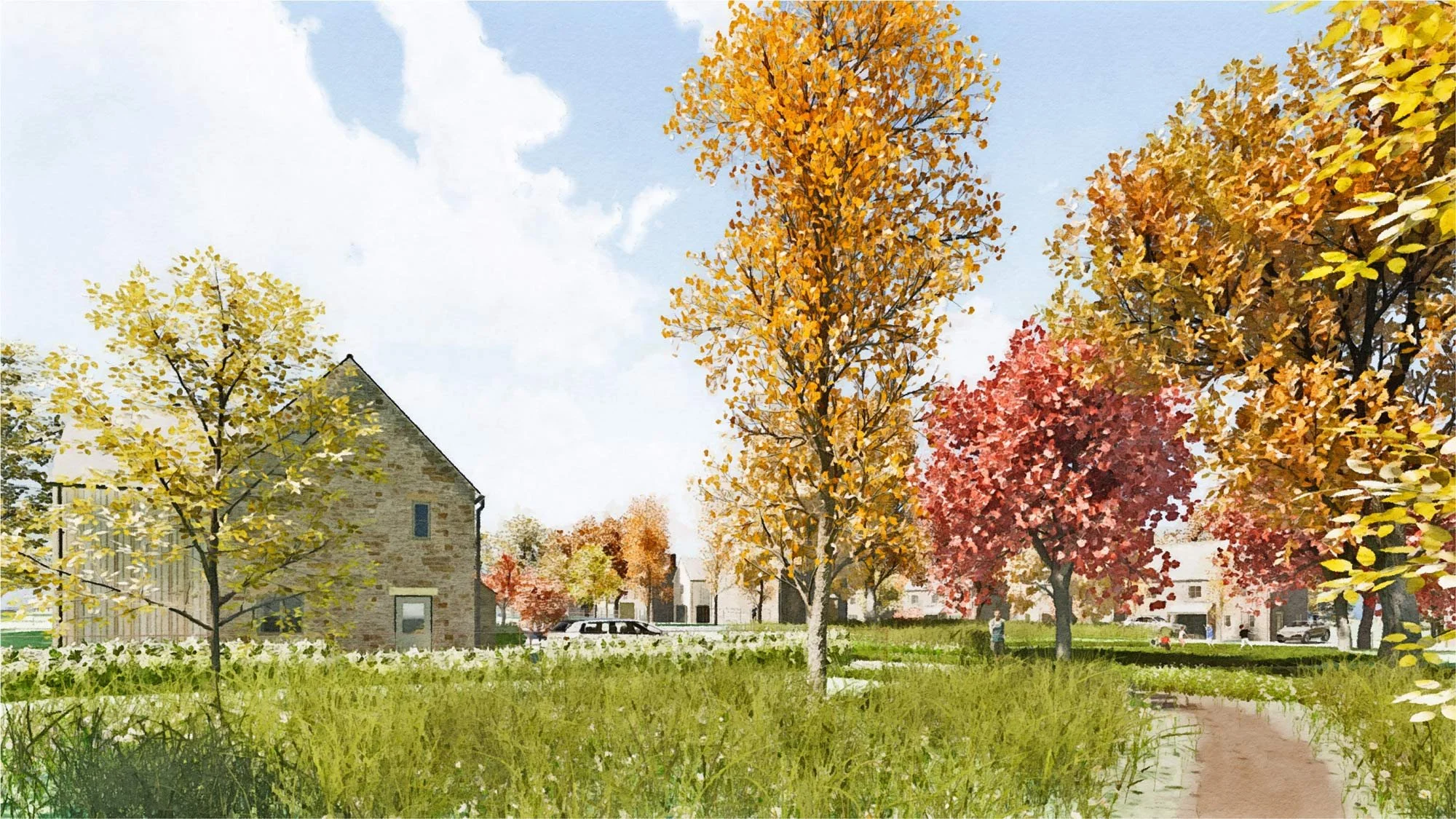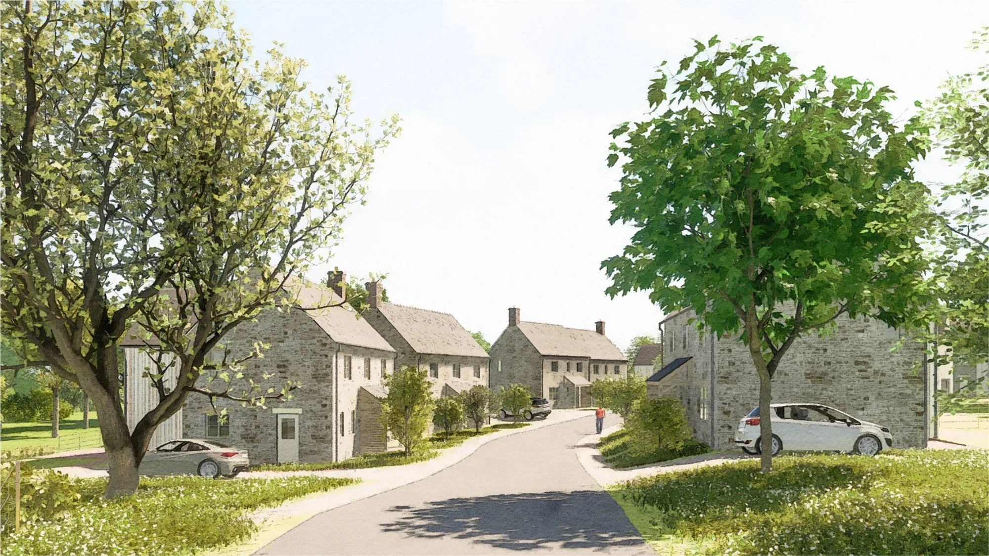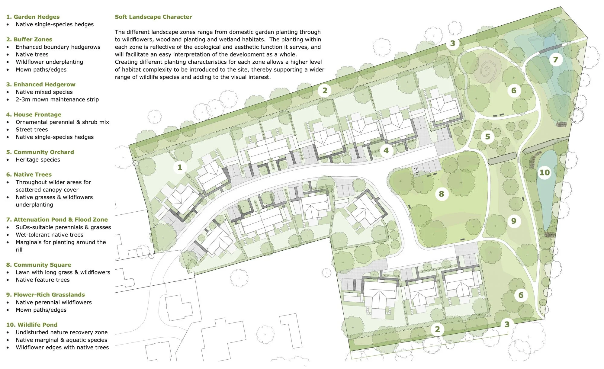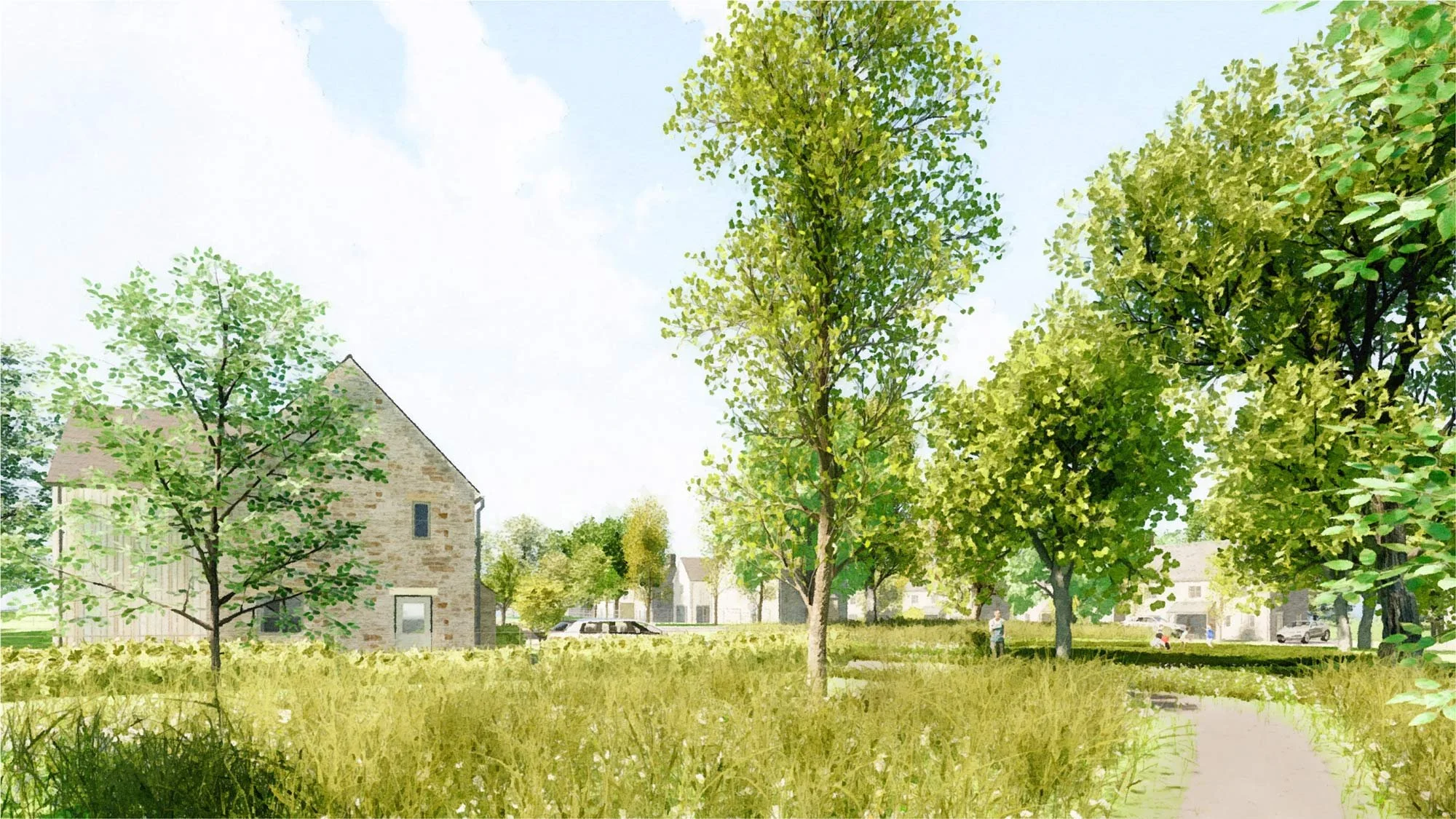 This development of 16 houses on the edge of a Cotswolds village includes a communal green, nature play areas, a wildlife pond, and carefully designed drainage systems to reduce the burden on local sewage networks. Due to the landscape-led approach of the design team and the extensive biodiversity enhancements we are able to propose, this scheme exceeds the BNG requirement of 10% by a healthy margin.
