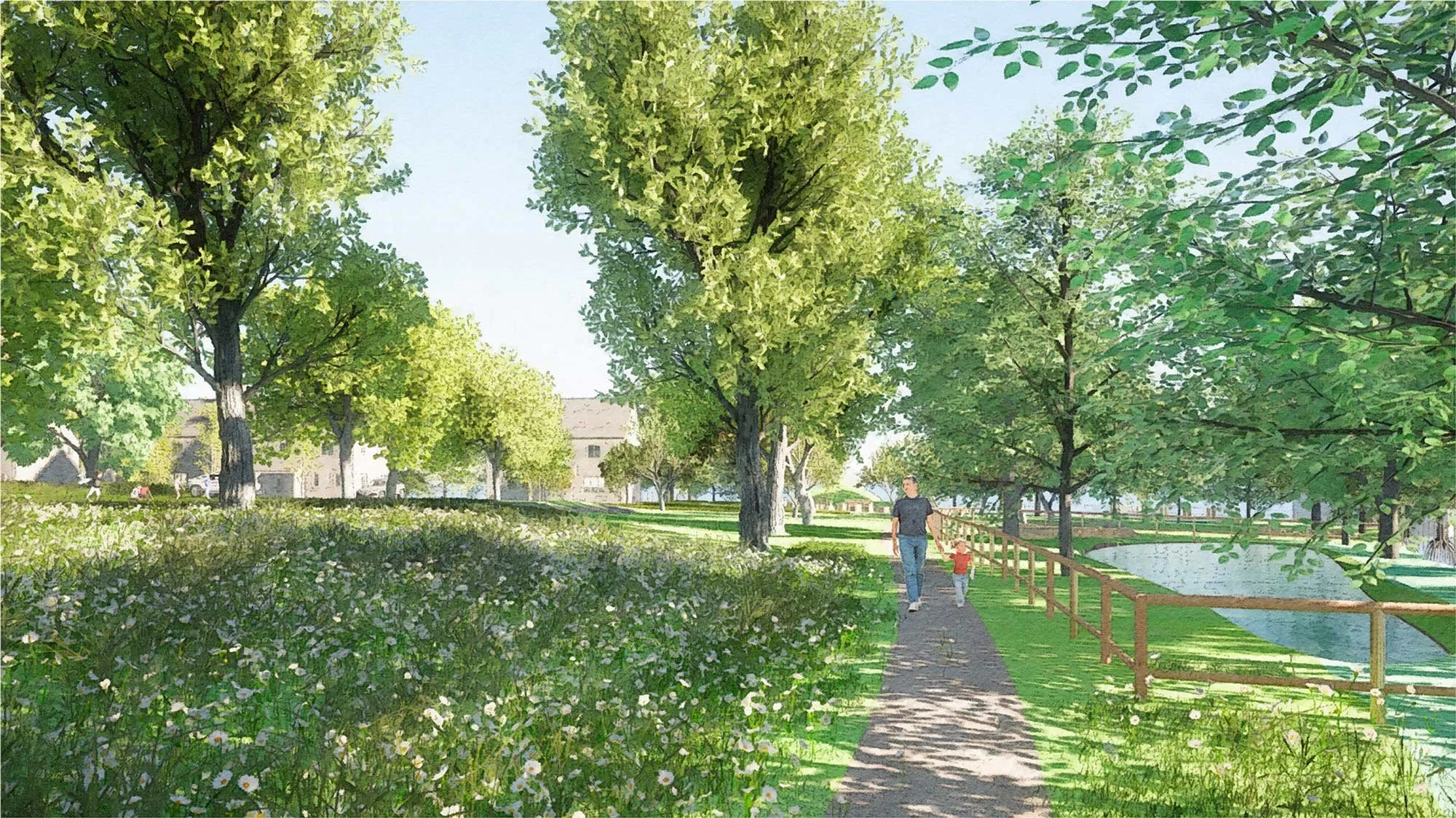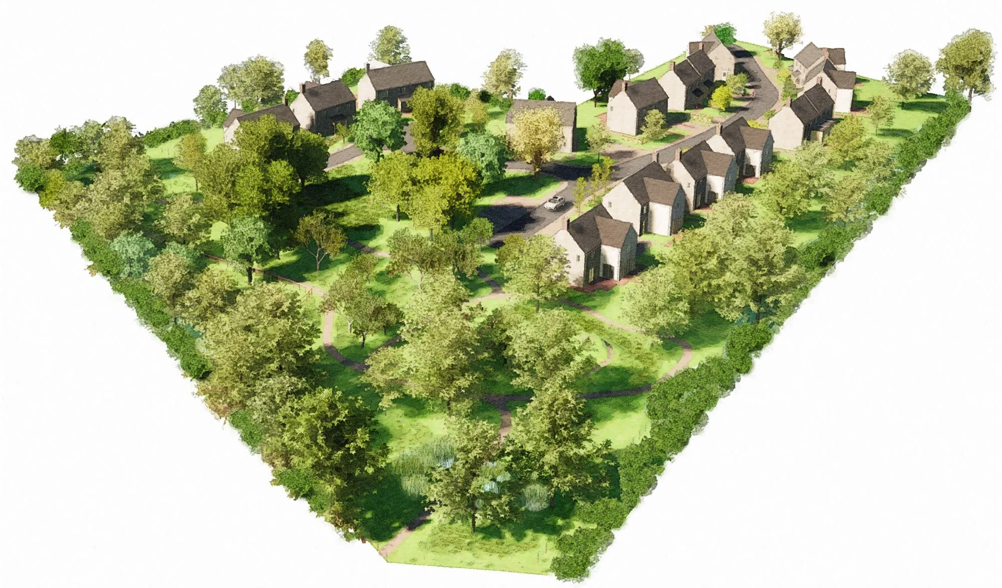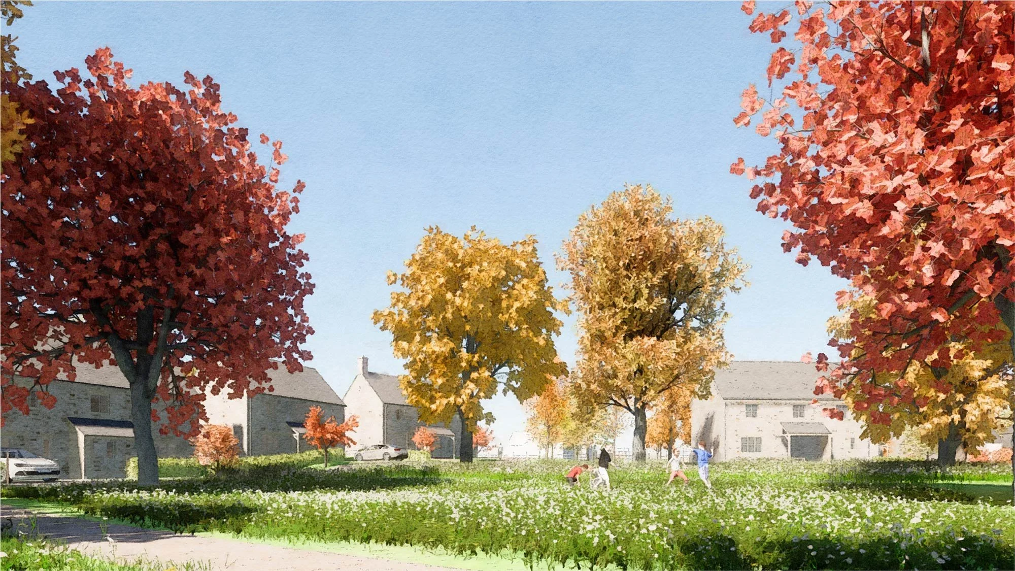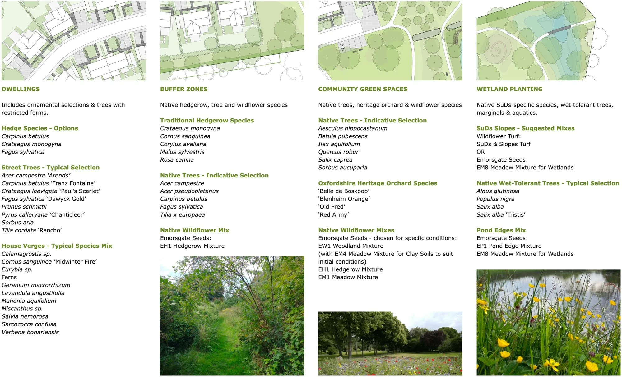 This development of 16 houses on the edge of a Cotswolds village includes a communal green, nature play areas, a wildlife pond, and carefully designed drainage systems to reduce the burden on local sewage networks. Due to the landscape-led approach of the design team and the extensive biodiversity enhancements we are able to propose, this scheme exceeds the BNG requirement of 10% by a healthy margin.
